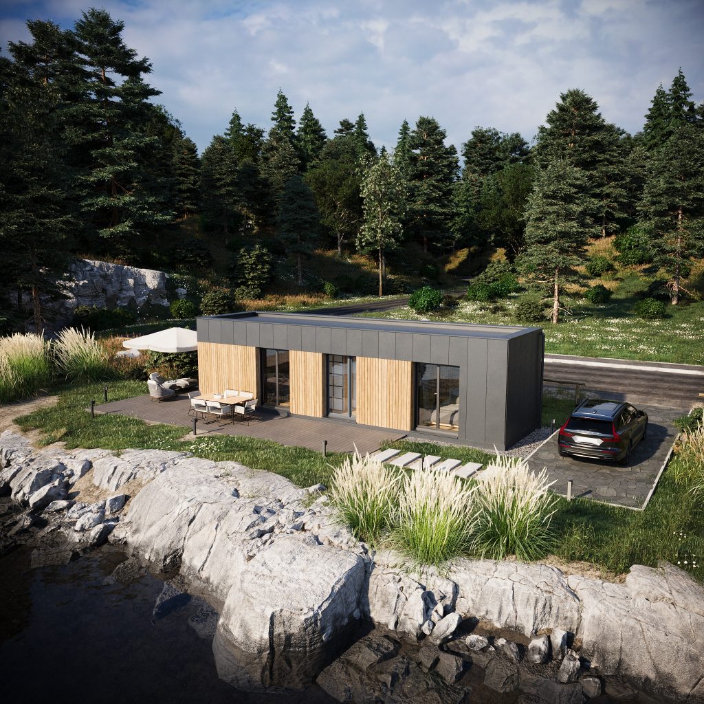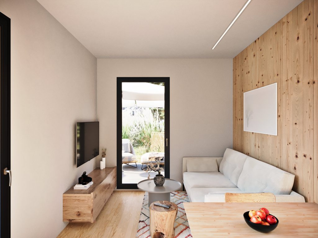 Unsere Wände/Decken/Boden werden mit Holzrahmenbau-Konstruktion in Tafelbauweise zu 100% im Werk industriell gefertigt. Als Dämmstoff benutzten wir Holzfaserdämmplatten, um die besten Energiewerte zu erreichen, wie auch der ökologische Abdruck nicht verloren geht. Mit einer PV-Anlage auf dem Dach, wird Energie+ Zertifizierung erreicht. Möglichkeit der Herstellung einer Fassade mit Materialien wie Holz, Eternit oder Putz. Eine Terrasse mit 10 m² ist bei jedem Modul dabei. Die weitere äussere Erschliessung des Objekts unterliegt individuellen Absprachen (z.B. Pergola, Überdachung, Sauna, Whirlpool und anderes).