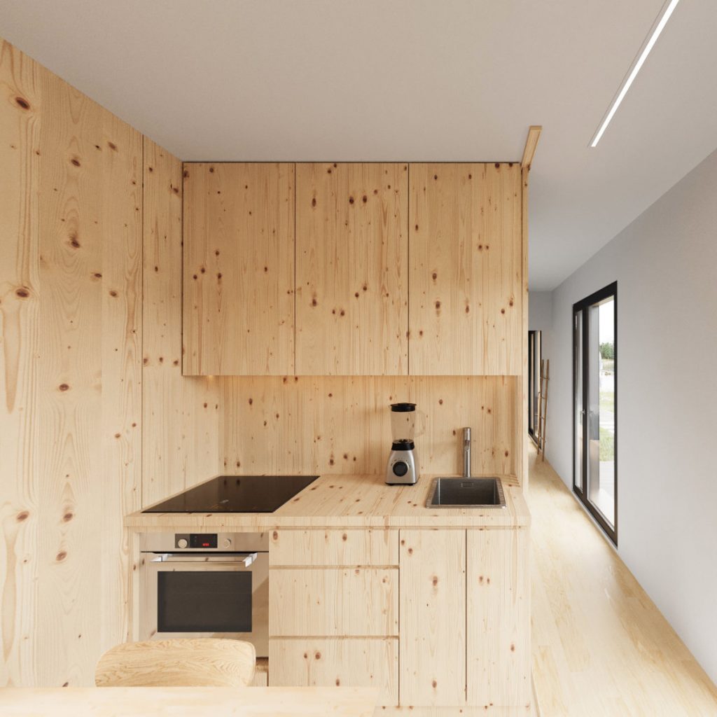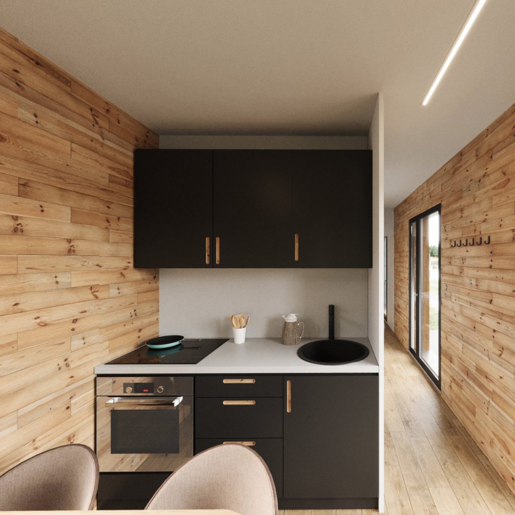 Möglichkeit des Innenausbaus und der Anordnung mit der Verwendung verschiedener langlebiger, ästhetischer und pflegeleichter Materialien wie z.B. Putz, Holzplatten, Bretter, Verkleidung, Paneele, Parkett, Keramikfliesen. Das Modul in jeder Version haben ein voll ausgestattetes Bad und eine Küche, es gibt 2 Standards Basis – Premium und natürlich individuell nach Kundenwunsch.